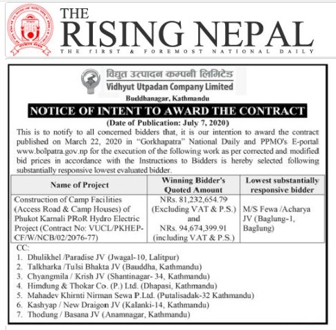 - Notice of Intent to Award The Contract :Construction of Camp Facilities(Access Road & Camp Buildings) of Phukot Karnali PRoR Hydro Electric Project (PKHEP)